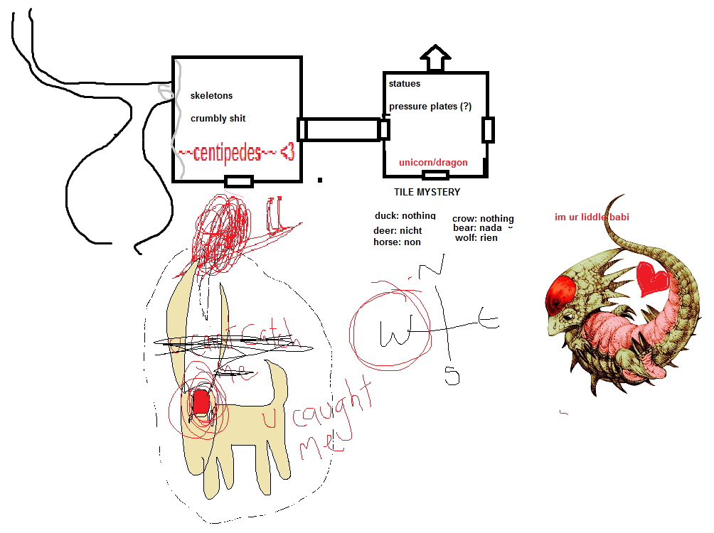 Then the zoological society showed up and they were assholes and were like GIVE US THE CARBUNCLE and we tried to lie to them but they pulled guns. So we bolted back towards the centipede room. Then we go there and Mateo mentioned the west wall was made of stucco. I bet he mentioned this like three times before but players. So anyway I was like OHHHHH STUCCO and sent Mr. Crushmore to body check it and there was a secret passage.
