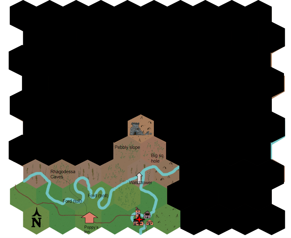 On the way to the ford they stopped by an inn. I hadn't put much prep into the inn, because I expected the whole river situation would take like 10 minutes, but here we were 90 minutes into the game and they still hadn't crossed the river and I guess they felt like roleplaying. So they won the friendship of the innkeeper, who tipped them off that her brother is a highwayman who charges a toll to use the ford (this was the only thing about the inn I had prepped). She also tipped them off to another ford, guarded by a troll, which is where she sends clients she doesn't like. She sent the party off with a token of her friendship, which they used to get past her brother safely. At long last, they forded the river.